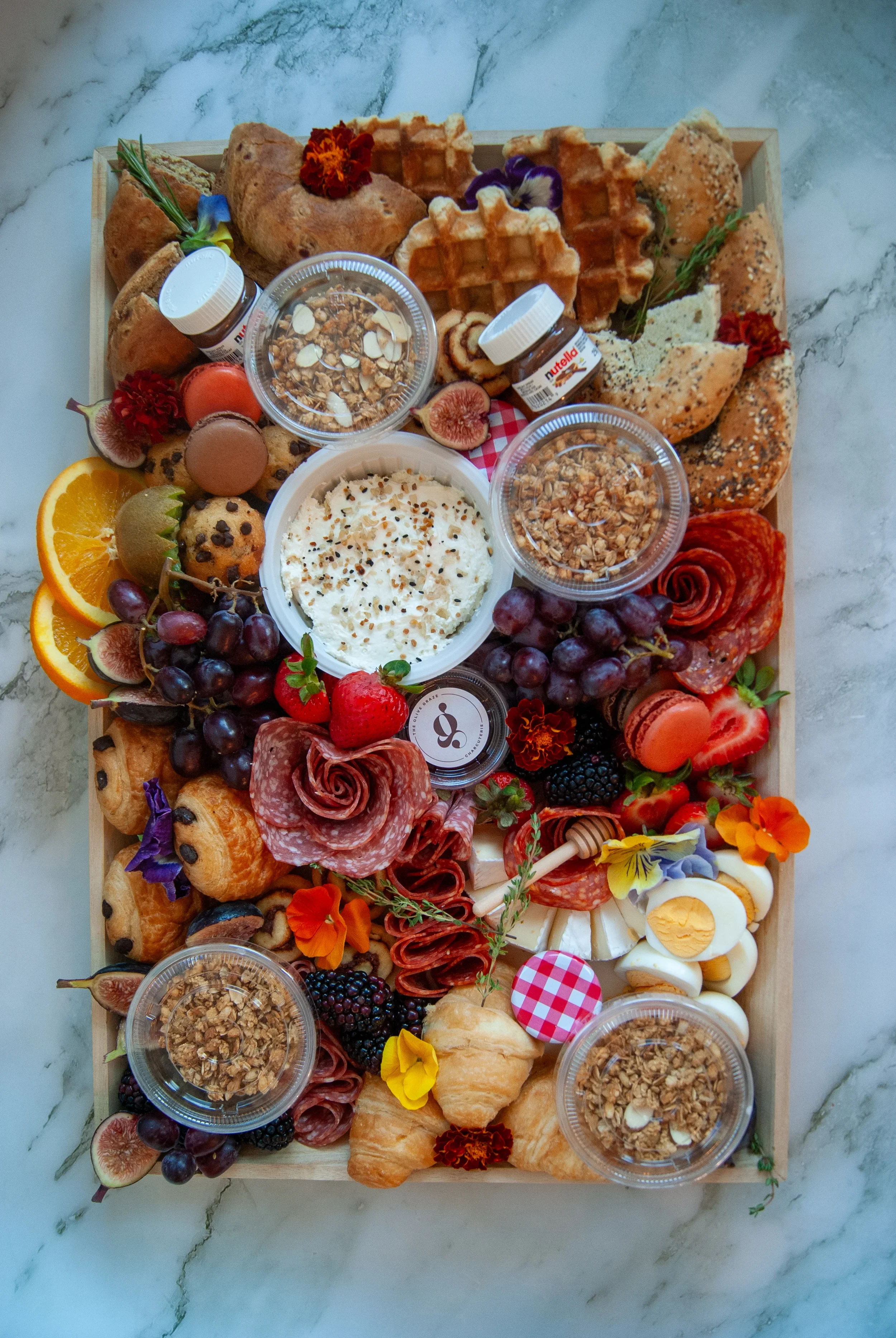 A stunning brunch centerpiece featuring a curated mix of sweet and savoury favourites - flaky pastries, fresh fruit, artisan bagels, mini waffles, spreads, cheeses, and charcuterie. Perfect for any morning celebration or mid-day event. Served beautifully on a wooden tray.