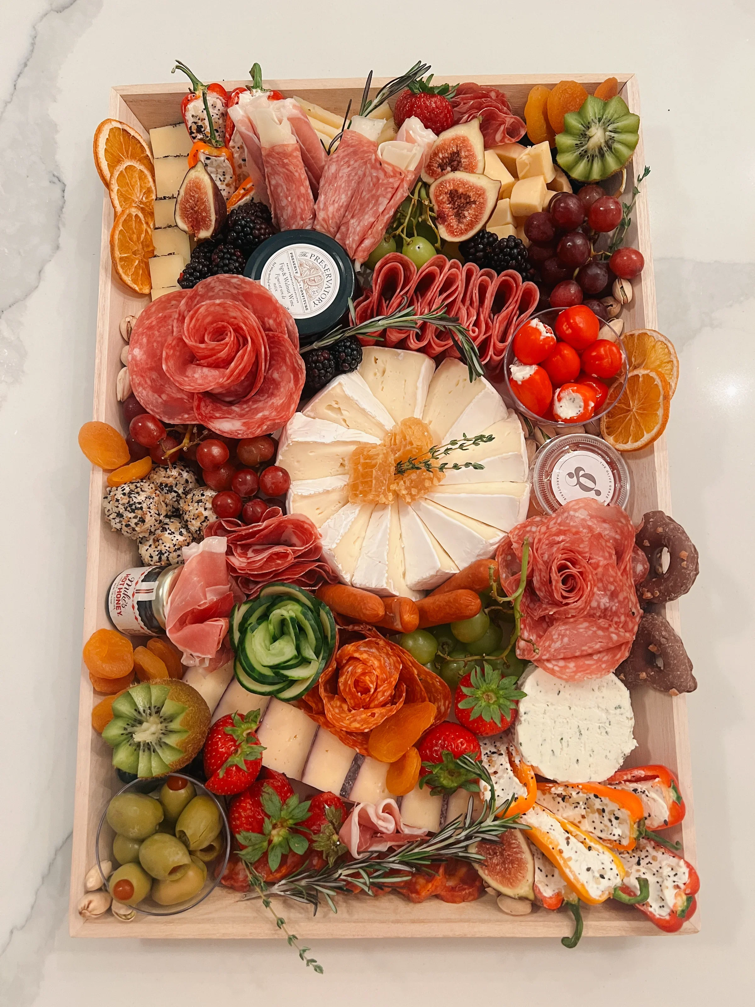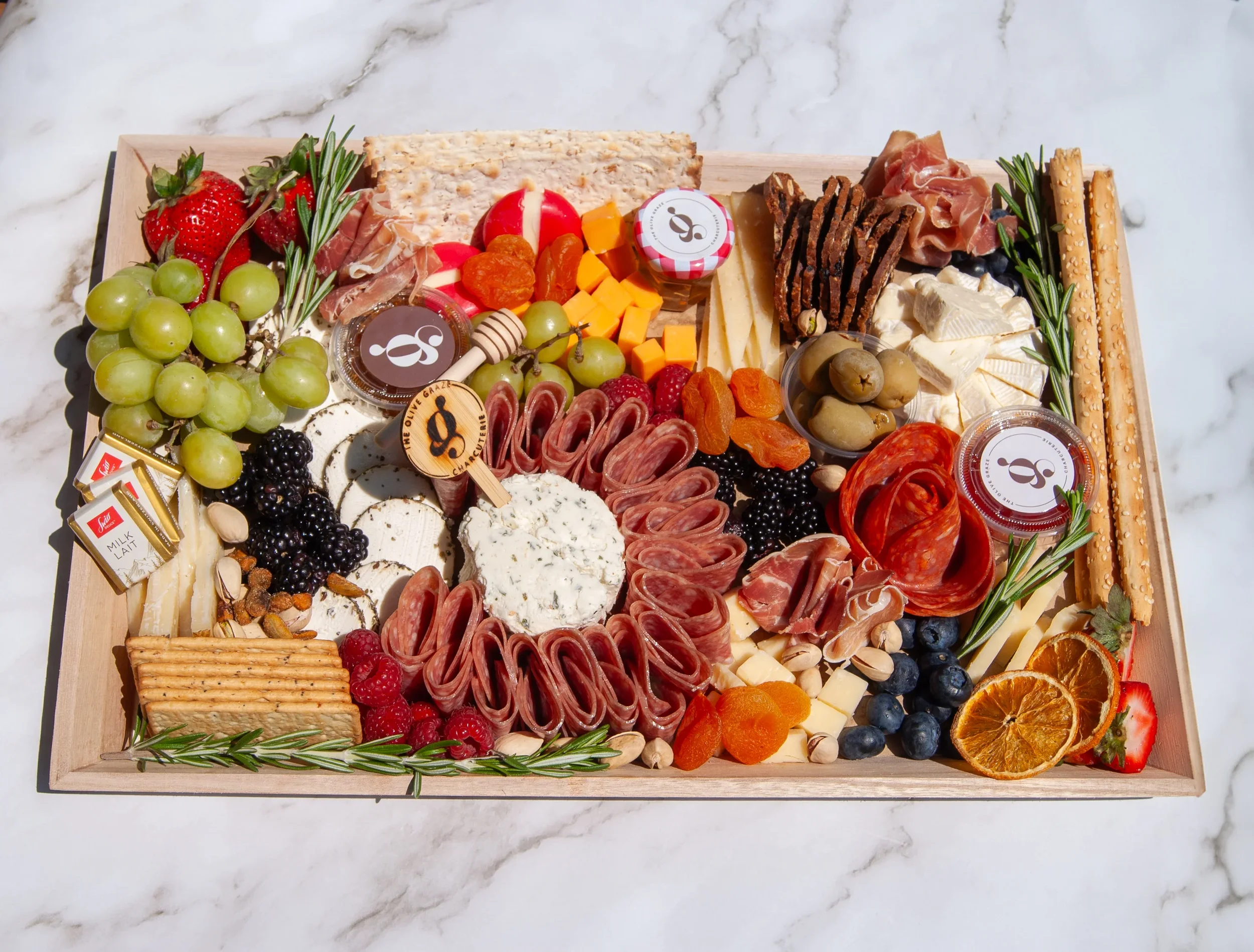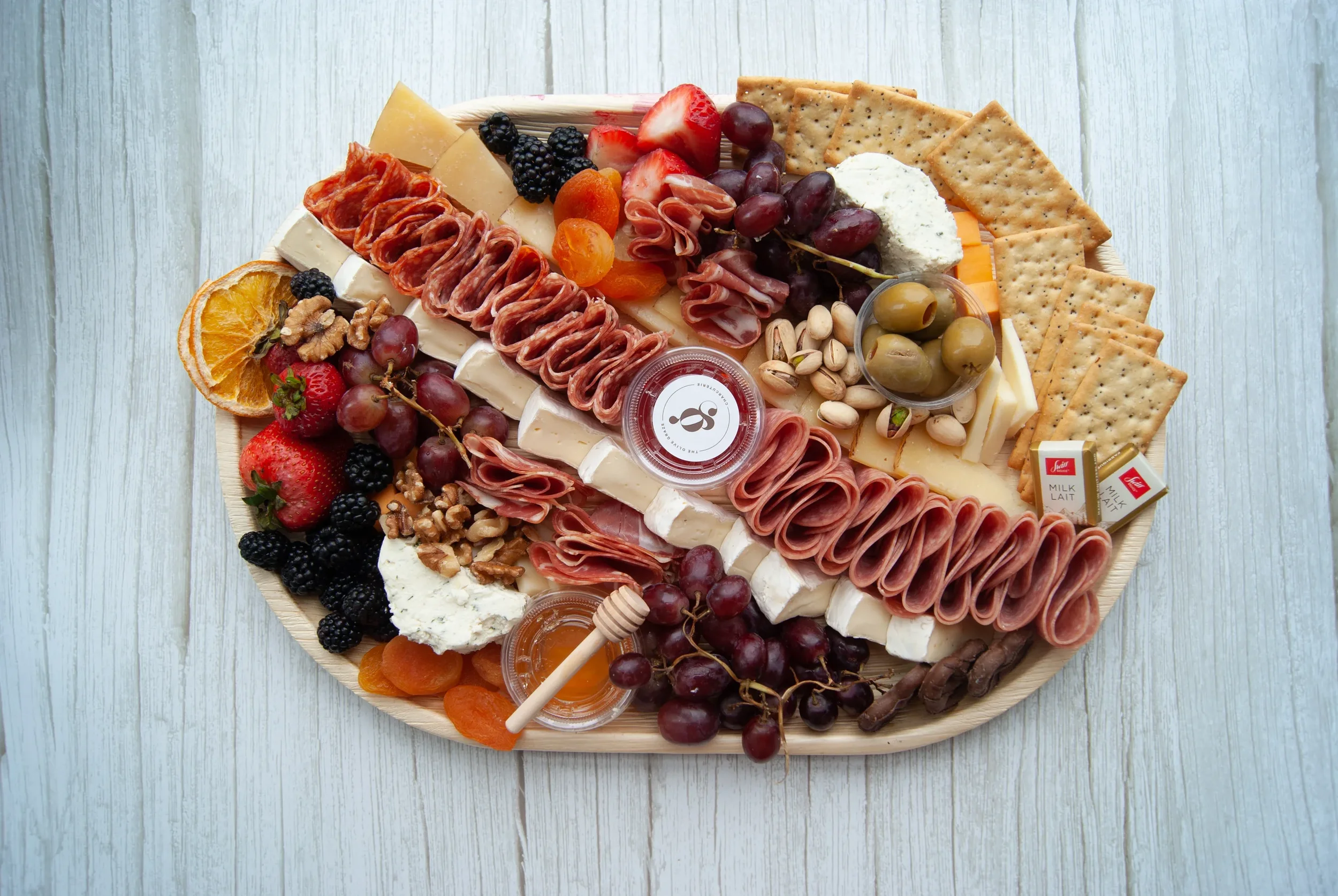 A shareable selection of artisan cheeses, charcuterie, fresh fruit, crackers, and gourmet extras. Perfect for small gatherings, celebrations, and gifting.